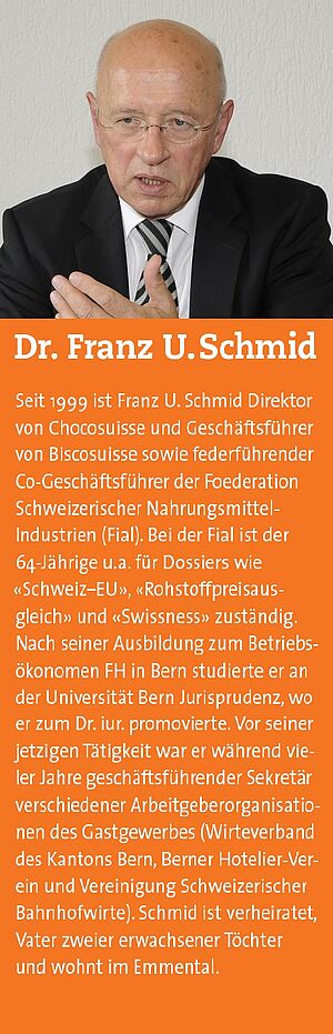 Franz U. Schmid: Mit Biscosuisse, dem Verband der Backwaren- und Zuckerwaren-Industrie, dessen Geschäftsführer ich auch noch bin, verfüge ich noch über eine dritte Herzkammer (lacht). Die Herausforderung besteht für mich darin, in jedem Bereich nach Möglichkeit zum richtigen Zeitpunkt die richtige Massnahme zu treffen. Beim Dachverband Fial geht die Arbeit tendenziell eher in die Breite, bei Chocosuisse und Biscosuisse in die Tiefe. Letztlich ist es der gute Mix von Breite und Tiefe, der meine Arbeit spannend macht und von dem die Mitglied-Firmen von Chocosuisse und Biscosuisse sowie die den Fial-Branchenverbänden angeschlossenen Firmen profitieren sollen.