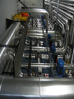 Die Ammoniakanlage produziert ein Wasser-Glykolgemisch von minus 8 Grad, welches zu den Kühlstellen gefördert wird. Der grösste Teil der durch den Kälteprozess entstehenden Abwärme fällt auf dem Temperaturniveau von etwa 35 Grad an, ein kleiner Teil als Gratiswärme durch Heissgasabkühlung auf dem Niveau von 60 Grad.