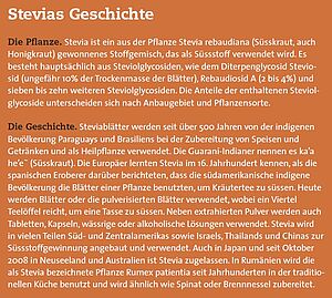 Als Stevia angepriesene Produkte sind jedoch vielfach Steviol-Glykosid, das heisst das durch einen chemischen Prozess gewonnene Süssstoff-Extrakt aus der Pflanze. Der Einsatz von unbehandeltem Steviakraut ist in der Schweiz nach wie vor nicht zugelassen. Aus diesem Grund ist Stevia denn bisher auch keine Option für die Bioverarbeitung. Zwar besteht kein Mangel an einem entsprechenden Bioangebot, aber die in der Schweiz erlaubten Steviol-Glykoside sind aufgrund ihres Herstellprozesses nicht biokonform.