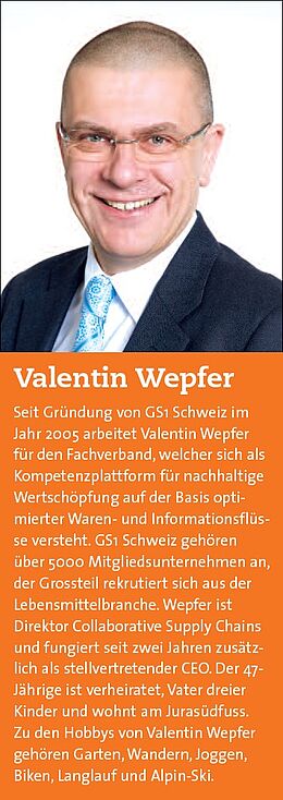 Valentin Wepfer: Ein wichtiges Stichwort heisst Nachhaltigkeit. Als Fachorganisation fühlen wir uns verpflichtet, diese Thematik aufzugreifen. Und das ist zwingend notwendig. Europa kommt mit Forderungen wie der Rückverfolgbarkeit und Deklaration auf uns zu. Wie viel Wasser benötigt die Herstellung des Produktes? Wie sieht der CO2-Footprint aus? Wie werden die Werte gemessen? Das sind alles Fragen, die wir künftig entlang der ganzen Supply Chain beantworten müssen. Kurz zusammengefasst geht es darum, Informationsund Warenflüsse zu verfolgen, um am richtigen Ort jeweils die richtige Information in der richtigen Form zur Verfügung zu haben. Diesbezüglich stehen wir ganz am Anfang. Darum haben wir uns entschlossen, sowohl auf Stufe Schweiz eine Fachgruppe ins Leben zu rufen als auch bei der globalen GS1-Fachgruppe mitzuwirken. In diesem Gremium wollen wir gemeinsam Lösungen erarbeiten, damit die vorhandenen Nachhaltigkeitsstandards möglichst einheitlich angewandt werden.