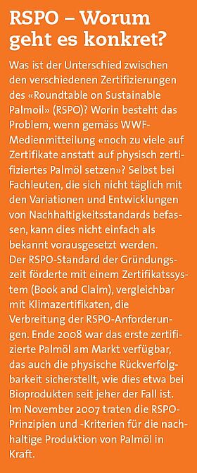 Selbst für Branchenfachleute stellt sich zunächst einmal die Frage, welche Standards hier verglichen wurden und wo das konkrete Problem liegt. Der WWF kritisiert heute einen Standard, den die Umweltorganisation ab 2001 selber aufgebaut hat. Aus informellen Kooperationen mit Produzenten und grossen Handelsunternehmen ging die breit abgestützte Organisation RSPO hervor, als freiwillige Initiative aller an der Produktion, Verarbeitung und im Handel von Palmöl beteiligten Akteure mit dem Ziel, die Zerstörung von artenreichen Tropenwäldern zu begrenzen. Der WWF hat deshalb 2004 den Runden Tisch für nachhaltiges Palmöl (RSPO) initiiert, einen Mindeststandard für den Anbau von Palmöl.