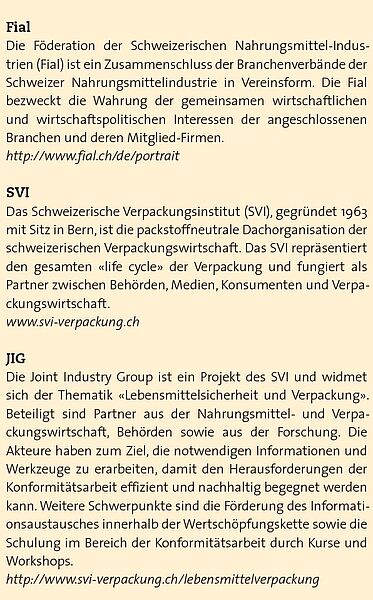 In den letzten Jahren hat sich das Wissen um diese Zusammenhänge und gleichzeitig der fachliche Austausch stark verbessert. Alle zwei Jahre organisieren das Schweizerische Verpackungsinstitut (SVI) und die Fial (Föderation der Schweizerischen Nahrungsmittel-Industrien) eine gemeinsame Lebensmitteltagung als Netzwerkplattform für die Verpackungs- und Lebensmittelbranche, Hersteller von Packmitteln, Verpackungen und Lebensmitteln und deren Zulieferanten sowie für den Handel.