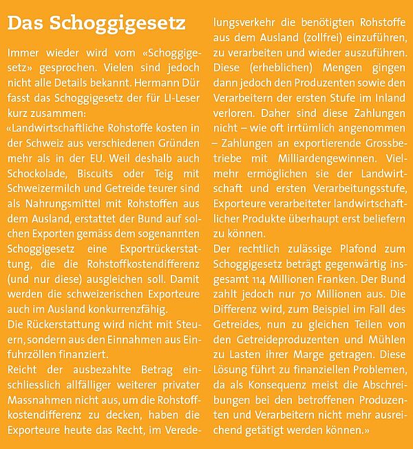 Hermann Dür: Das grösste Problem stellt sich im regulatorischen Umfeld: Bekanntlich plant der Bundesrat ein Rahmenabkommen mit der EU. Dieses würde der EU erlauben, in praktisch allen Schweizer Wirtschaftszweigen ihre Normen einzuführen, so auch bei und Daraus ergeben sich grosse Planungsunsicherheiten. Eine weitere Herausforderung stellt die Exportrückerstattung im Rahmen des sogenannten «Schoggigesetzes» dar. Der Bund könnte den betroffenen Firmen WTO-konform jährlich 114 Millionen Franken zurückerstatten, effektiv zahlt er aber nur 70 Millionen aus. Die Differenz wird seit ein paar Jahren von der Branche getragen. Das war nur deshalb zu verkraften, weil die Firmen ihre Abschreibungen nicht vollumfänglich vorgenommen haben. Für die Zukunft ist das jedoch keine Alternative.