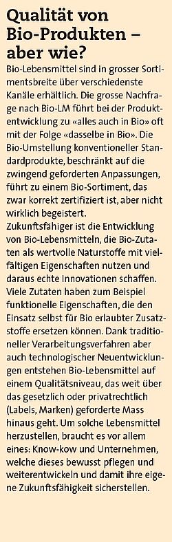 Die für die Bio-Verarbeitung traditionelle Zielsetzung, die Lebensmittel möglichst schonend und naturbelassen zu verarbeiten, gewinnt weit über die Bio-Branche hinaus an Bedeutung. Als «schonend» gelten gemeinhin handwerkliche und andere traditionelle Verfahren. Für die Bio-Verarbeitung und weitere so genannte «Clean Label»-Standards sind grundsätzlich physikalische Verfahren von Interesse, die zudem den Einsatz chemisch-synthetischer Hilfsmittel vermeiden helfen.