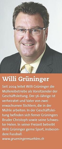 Willi Grüninger: Eine Prognose abzugeben ist sehr schwierig. Vieles hängt davon ab, ob und wann der Freihandel eingeführt wird. Wenn die Schutzzölle für Getreide und Mehl dereinst abgeschafft werden, wird es schwierig. Ich hoffe, dass unser moderner Müllereibetrieb solchen Herausforderungen gewachsen sein wird. Für uns als Eigentümer der Unternehmung steht auf jeden Fall fest, dass wir die Firma als Familienbetrieb weiter führen wollen. Die nächste, vierte Generation arbeitet bereits in der Mühle.