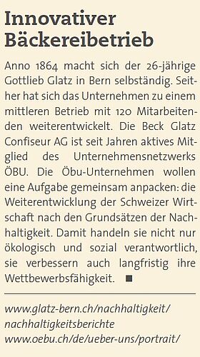Gewerbebetriebe und KMUs scheuen häufig noch immer die Aufwände, ihre Nachhaltigkeitsleistungen zu dokumentieren und als strategische Unternehmensziele zu kommunizieren. Sie vergeben damit viel Potenzial für die verstärkte Glaubwürdigkeit und damit die Kundenbindung. Heute stehen zeitgemässe Instrumente zur Verfügung, um auf gewerbetaugliche Weise die Zielsetzungen und Massnahmen zu definieren und in einem Nachhaltigkeitsbericht zu dokumentieren. Das Beispiel von Beck Glatz Confiseur zeigt, dass die aktive Kommunikation der Nachhaltigkeitsleistungen nicht den Grossbetrieben überlassen bleiben muss.