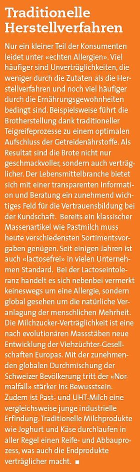 Die von Konsumentenorganisationen kritisierte Deklaration «…kann Spuren von xy enthalten» bringt die Herausforderungen der Lebensmittelindustrie angesichts der grossen Produktvielfalt zum Ausdruck. Technologisch bedingt kommt dieser Hinweis besonders häufig bei Schokoladenprodukten zum Ausdruck. Beim traditionellen Schokoladeherstellverfahren sind keine Reinigungsschritte mit Wasser möglich. Ein Wassereintrag bewirkt eine vorzeitige Erhärtung der Schokolade und beeinträchtigt die Qualität. Im Extremfall führt dies zur Blockierung ganzer Anlagen. Mit einer Optimierung der Chargenplanung und der jeweiligen Trennmengen kann sichergestellt werden, dass es zu keinen unerwünschten Vermischungen kommt. Bei medizinisch belegten Allergiediagnosen, zum Beispiel als Reaktion auf Nüsse oder Weizengluten, stossen viele klassische Herstellungsmethoden an Grenzen. Genau für diese Fälle steht der Vermerk «…kann Spuren von xy enthalten» auf den Verpackungen: Als Schutzhinweis für betroffene Kunden.