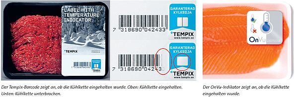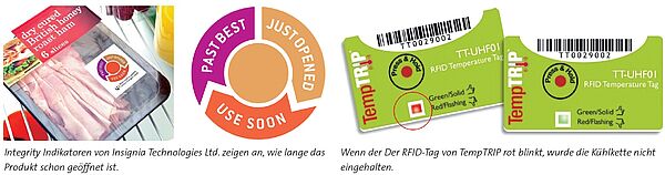 Die Weiterentwicklung von Datenträgern hat die NFC- (Near Field Communication) und die RFID-Technologie (Radio Frequency IDentification) hervorgebracht, die nun auch in smarten Lebensmittelverpackungen Anwendung finden. Dabei handelt es sich um kontaktlose Kommunikationstechniken, welche die Identifikation eines Produktes via elektromagnetische Wellen ermöglichen. Besonders vorteilhaft gegenüber den Barcodes ist, dass mit NFCund RFID-Tags kein Sichtkontakt mehr erforderlich ist, um Daten zu lesen und, dass letztere über eine noch höhere Speicherkapazität verfügen. Fortgeschrittenere RFID-Systeme erlauben zudem die Integration von weiteren Funktionen in die RFID-Tags. So kann beispielsweise eine Kombination von Zeit-Temperatur-Indikator oder Frische-Indikator mit einem RFID-Tag den Temperaturverlauf oder Qualitätsinformationen eines Produktes während der ganzen Lieferkette in Echtzeit erfassen und der Produktstatus jederzeit abgerufen werden. Für die kombinierte Anwendung der RFID- und Sensor-Technologie besteht besonders in der Kühlkette sehr grosses Zukunftspotenzial.