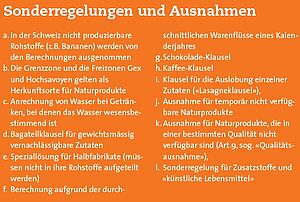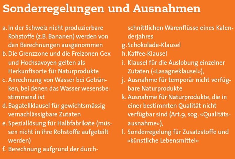 Die neue Swissness-Gesetzgebung tritt am 1. Januar 2017 in Kraft. Dazu gehören das revidierte Markenschutzgesetz (MSchG), die Verordnung über die Verwendung von schweizerischen Herkunftsangaben für Lebensmittel (HasLV) und die WBF-Verordnung mit weiteren Detailregelungen zur Swissness bei Lebensmitteln. Die Schweizer Unternehmen bereiten sich spätestens seit der Verabschiedung der wichtigsten Eckwerte durch Parlament und Bundesrat auf die neue Swissness-Gesetzgebung vor. Grundlage der Swissness-Regulierung für Lebensmittel sind zwei einfache Grundsätze: Erstens müssen 80 Prozent der Rohstoffe aus der Schweiz stammen (bei Milch und Milchprodukten 100 Prozent der Milch) und zweitens muss der wesentliche Verarbeitungsschritt in der Schweiz erfolgen. Die Prozesse und Märkte im Bereich der Lebensmittelverarbeitung sind komplex. Um dieser Komplexität und den entsprechenden Bedürfnissen der Industrie gerecht zu werden, wurden diese an sich simplen Grundprinzipien mit einer ganzen Reihe von weiteren Bestimmungen und Ausnahmen ergänzt. Die Palette von Ausnahmen, welche zu Gunsten der Industrie im Gesetz und in der HasLV festgehalten wurden, dient dazu, die rechtlichen Bestimmungen unter Berücksichtigung der parlamentarischen Entscheidungen möglichst praxisgerecht zu gestalten. Dass dabei jede Ausnahme auch einer Erhöhung der Komplexität gleichkommt, wurde in Kauf genommen.