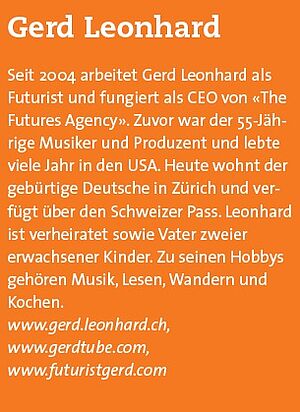 Gerd Leonhard: Bereits heute stellen wir einen klaren Trend nach gesunden Produkten fest. Diese Entwicklung wirkt sich dramatisch verstärken. Lebensmittel mit E-Stoffen werden ganz «out» sein. Der Konsument wird hauptsächlich frische Produkte, Lebensmittel in Bio- oder Demeter-Qualität und organische Angebote bevorzugen. Den Kunden wird zunehmend bewusst, dass man wird, was man isst. Und: 3D-Druck wird zum ganz grossen Thema.