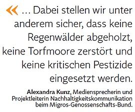 Auch Coop fördert die nachhaltige Beschaffung dieses wichtigen Schlüsselrohstoffs, wie Mediensprecherin Alena Kress bestätigt: «Coop setzt bereits seit vielen Jahren auf nachhaltiges Palmöl, das die Kriterien des ‹Round Table on Sustainable Palm Oil›, kurz RSPO, erfüllt. Nun gehen wir einen Schritt weiter: Zukünftig setzen wir auch für unsere konventionellen Eigenmarkenlebensmittel auf Bio-Knospe-Palmöl. Bio-Knospe-Palmöl erfüllt deutlich höhere Anforderungen als RSPO, aber auch als EU-Bio-zertifiziertes Palmöl. In ausgewählten Eigenmarkenprodukten ersetzt Coop Palmöl zudem, wenn sinnvoll und machbar, ganz durch andere Öle und Fette.»