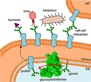 Wenn Zellen Signale empfangen, mit anderen Zellen interagieren oder Viren und Bakterien erkennen, sind stets nicht nur Proteine beteiligt, sondern auch Zuckerketten, die auf deren Oberfläche befestigt sind. Diese bisher weniger beachteten, ganz unterschiedlich zusammengesetzten und verzweigten Gebilde tragen offenbar dazu bei, dass Proteine sich richtig falten und ihre spezifischen Aufgaben erfüllen können. Verschiedene Beobachtungen zeigen, wie wichtig die Zuckeranhängsel sind: Gleiche Proteine mit verschiedenen Zuckerketten haben unterschiedliche Funktionen. Kranke und gesunde Zellen tragen andere Zusammensetzungen der Zucker auf ihrer Oberfläche. Und Medikamente, die damit versehen sind, werden offenbar besser vertragen. Rund um diese sogenannten Glykane wird heute intensiv geforscht. Nach Genomik und Proteomik gibt es nun auch Glykomik.