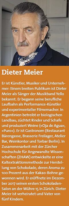 Der bekannte Künstler und Unternehmer Dieter Meier ist mit seiner Schokoladenfirma gestartet. Im Interview berichtet er über die Details des neuartigen Herstellungsverfahrens und über seine Ziele. Bis im Herbst dieses Jahres sieht er vor, eine Betriebsstätte zu beziehen. Pläne bestehen auch bezüglich Vertrieb: Dieter Meier sucht in Europa und vor allem auch im Mittleren Osten und in Hongkong nach kleinen Ladenlokalen. Ergänzend dazu wird er einen Webshop aufbauen.