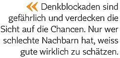 Wir Schweizer Konsumenten gehen dafür über die Grenze einkaufen. Wie würden die Zahlen des Käseexports aussehen, wenn wir den Euro eingeführt hätten? Ist ein Gewinn für die Branche und die Natur mit weniger Grenzschutz kombinierbar? Solche und ähnliche Fragen sollten wieder gestellt werden. Denkblockaden sind gefährlich und verdecken die Sicht auf die Chancen. Nur wer schlechte Nachbarn hat, weiss gute wirklich zu schätzen. Wir haben gute. Zeit, sie wieder wahrzunehmen.