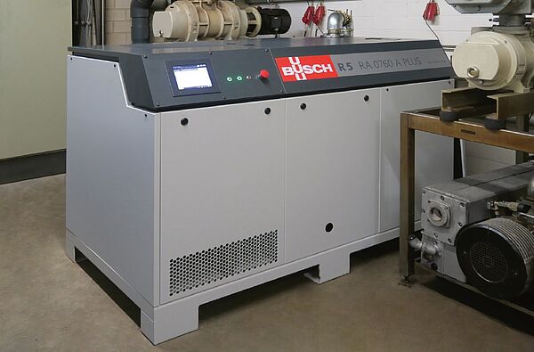 Um den Energieverbrauch möglichst noch weiter zu senken, haben sich Thomas Pelke als Leiter der Instandhaltung und Bernd Wörner als Verantwortlicher für den Bereich Energie dazu entschieden, zu Testzwecken die neue Drehschieber-Vakuumpumpe R 5 0760 A PLUS von Busch einzusetzen. Diese Vakuumpumpe, hat serienmässig einen frequenzgeregelten Motor und eine integrierte Steuerung. Über einen Drucksensor wird permanent das Vakuumniveau am Eingang zur Vakuumpumpe gemessen. Dadurch kann die R 5 0760 A PLUS schnell auf etwaige Bedarfsänderung reagieren und durch die Drehzahl das Saugvermögen dem tatsächlichen Bedarf anpassen. Der Regelbereich liegt zwischen 35 und 60 Hertz, was einem Saugvermögen von 440 bis 760 Kubikmeter pro Stunde entspricht.