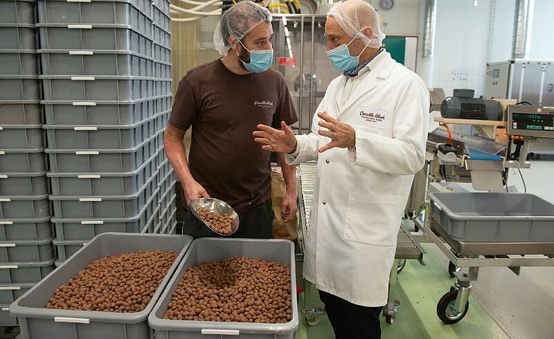 Wir suchen die Differenz, das Alleinstellungsmerkmal. Das heisst zuerst einmal, dass wir einzigartige Spezialitäten herstellen. Wir sind aber auch ein unabhängiges Familienunternehmen, und wollen unkompliziert und bescheiden bleiben. Dies erreichen wir, in dem wir den gesamten Produktionsprozess «von der Bohne bis zum Riegel» hier in Courtelary konzentrieren. Wir sind ein verlässlicher Partner, für unsere Mitarbeiterinnen und Mitarbeiter, für unsere Lieferanten und Partner, für unsere Besucherinnen und Besucher, für unsere Konsumenten und Konsumentinnen. 2020 haben wir unsere neue Linie «SO NUTS» eingeführt. Wir sind heute stolz darauf, dass wir unsere wichtigsten Rohstoffe, Haselnüsse und Mandeln, seit letzten Juni nun auch selber in Courtelary mit feinem Ragusaoder Torino-Überzug dragieren können. Ganz neu auch die «SO NUTS-Coffee», eine bei uns sorgfältig geröstete Mandel, die mit einer feinen Schicht aus Guatemala-Kaffeebohnenpulver den perfekten ausgewogenen Koffein-Snack für unsere so mobile Welt ausmacht.