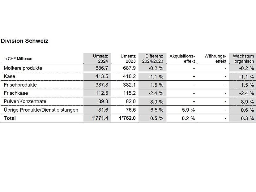 Die Division Schweiz erwirtschaftete ein volumengetriebenes organisches Wachstum von 0.3 Prozent im Rahmen der eigenen Erwartungen und einen Umsatz von CHF 1’771.4 Millionen (Vorjahr: CHF 1’762.0 Millionen). Der von der Branchenorganisation Milch (BO Milch) festgelegte, in der Gesamtjahresbetrachtung leicht tiefere Milchpreis sowie die negativen Volumeneffekte bei Butter belasteten zwar die Umsatzentwicklung im Heimmarkt. Allerdings konnten diese Effekte durch die positive Umsatzentwicklung mit innovationsstarken Markenkonzepten wie Emmi Caffè Latte, Emmi Energy Milk, Aktifit, I'm your meal und Luzerner Rahmkäse kompensiert werden. Mit dem Einsatz von PET-Flaschen bei diversen Emmi Marken wie Emmi Energy Milk oder dem Comella Drink verstärkte Emmi ihr Nachhaltigkeitsengagement im Bereich Kreislaufwirtschaft. Erfreulich entwickelte sich zudem der Umsatz mit Milchpulver im Industriekundengeschäft. Die im Oktober 2024 abgeschlossene Akquisition von Hochstrasser trug als Akquisitionseffekt mit 0.2 Prozent zum Wachstum bei.