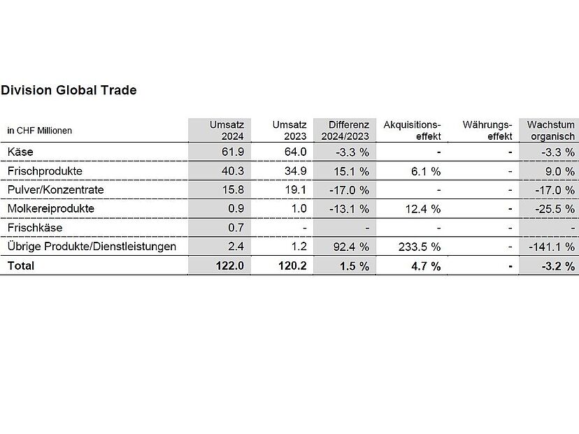 Die Division Global Trade erwirtschaftete einen Umsatz von CHF 122.0 Millionen (Vorjahr: CHF 120.2 Millionen). Bereinigt um den Akquisitionseffekt aus der Verschiebung von Distributionskanälen von der Division Europa zur Division Global Trade ging der Umsatz organisch um 3.2 Prozent zurück. Der Umsatzbeitrag aus dem Export von Frischprodukten, wie Joghurts nach Nordeuropa, erhöhte sich jedoch deutlich. Hingegen war der Umsatz mit Regulierungsexporten von Magermilchpulver aus der Schweiz rückläufig.