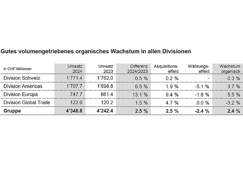 - Starker Umsatz mit breit abgestütztem, vollumfänglich volumengetriebenem organischen Wachstum von 2.4 Prozent; Akquisitionseffekt 2.5 Prozent; Währungseffekt -2.4 Prozent