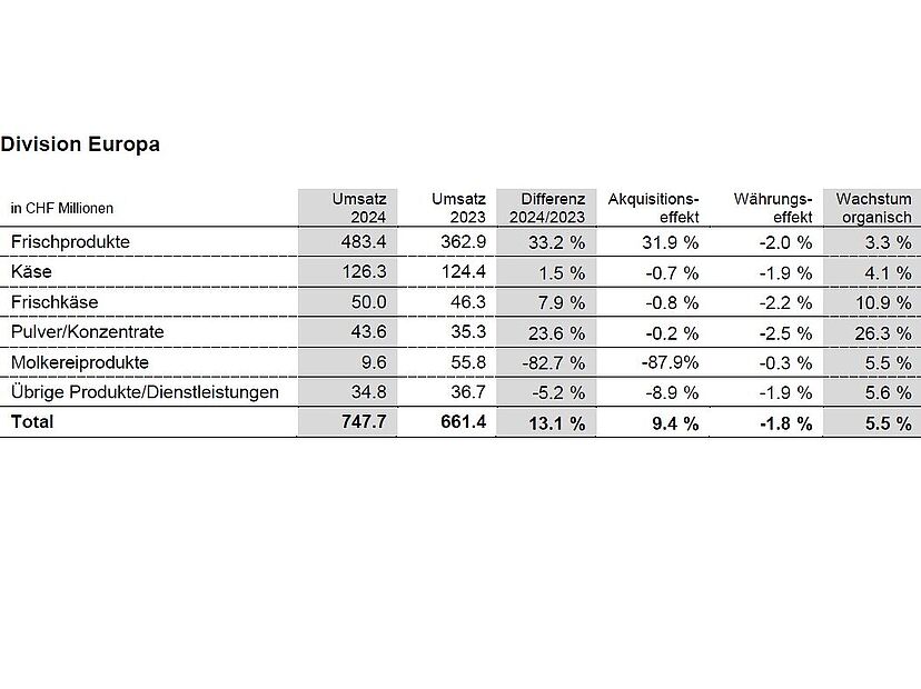 Die Division Europa wies ein starkes organisches Wachstum von 5.5 Prozent aus, das deutlich über den eigenen Erwartungen lag. Emmi Caffè Latte insgesamt und insbesondere in Grossbritannien, die italienischen Dessertspezialitäten und Kaltbach Käse in Deutschland, den Niederlanden und Grossbritannien legten ebenso zu wie der Umsatz mit Ziegenmilchpulver und -frischkäse in den Niederlanden. Unter Berücksichtigung der insgesamt positiven Akquisitions- und negativen Währungseffekte stieg der Umsatz insgesamt um 13.1 Prozent auf CHF 747.7 Millionen (Vorjahr: CHF 661.4 Millionen). Der Akquisitionseffekt von Mademoiselle Desserts überkompensierte den Devestitionseffekt aus der Veräusserung der Gläsernen Molkerei im Geschäftsjahr 2023 somit deutlich.
