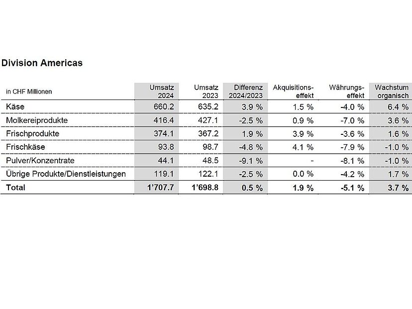 Die Division Americas erzielte ein über den eigenen Erwartungen liegendes organisches Wachstum von 3.7 Prozent mit einem Umsatz von CHF 1’707.7 Millionen (Vorjahr: CHF 1’698.8 Millionen). Zur positiven Entwicklung trugen einmal mehr die wichtigen Märkte Brasilien, Chile, Mexiko und die USA bei. In den USA lieferten sowohl lokal verankerte Geschäfte wie die führende Marke im US-Feta-Markt, Athenos, oder Ziegenmilchprodukte der in den USA einzigen nationalen Marke Meyenberg, als auch aus der Schweiz importierte Käsespezialitäten einen wesentlichen Beitrag. Auch der Umsatz mit Premium-Desserts von Emmi Dessert USA legte im zweiten Halbjahr nach dem erwarteten Rückgang im ersten Halbjahr wieder zu. Ebenfalls sehr erfreulich entwickelte sich der Umsatz in der strategischen Nische Ready to Drink-Kaffee mit Kaiku Caffè Latte in Spanien. Die Milchknappheit in Tunesien hemmte hingegen das Wachstum der Division. Das im Mai 2024 erworbene Unternehmen Verde Campo trug als Akquisitionseffekt zur Umsatzsteigerung bei, allerdings dämpften stark negative Währungseffekte die Umsatzentwicklung.
