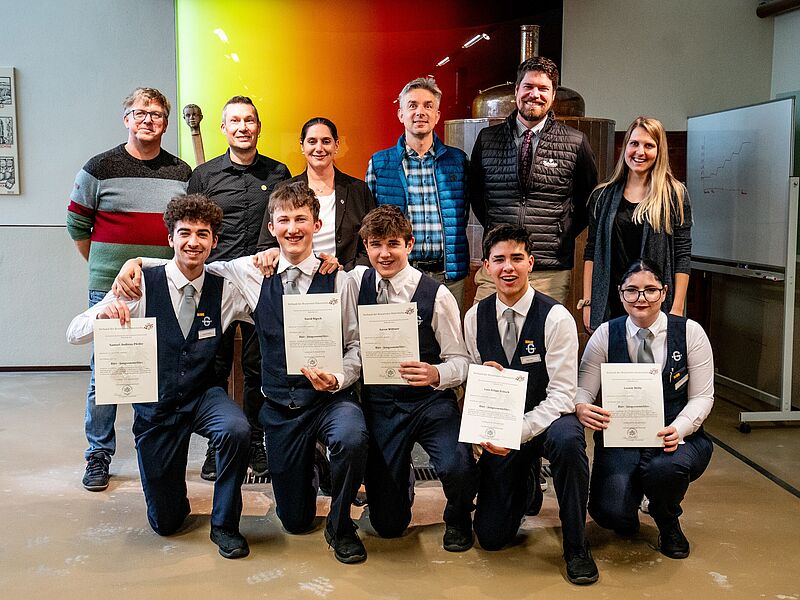 Die ersten sieben von der Mohrenbrauerei und der Gastgeberschule Gascht ausgebildeten Bier-Jungsommeliers bzw. zur Bier-Jungsommelières freuen sich über das europaweit anerkannte Zertifikat. © Sabrina Schneider